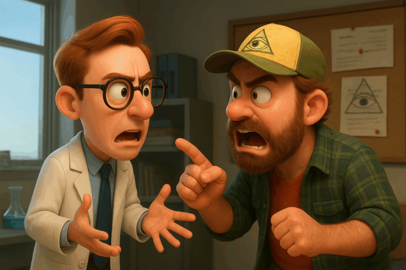 Jedan od najvećih izazova u diskusijama jeste polemika o teorijama zavere. Što zbog sklonosti njihovih zagovornika da brane sopstvene tvrdnje i pored jasnih dokaza koji ih opovrgavaju (kognitivna pristrasnost poznata kao ušančivanje), što zbog posebnog svojstva partikularnih iskaza na koje se teoretičari zavera oslanjaju, a to je neopovrgljivost. Primera radi, iskaz Neke biljke leče ćelavost nije moguće opovrgnuti, jer niko ne može da tvrdi da neka ljudima i dalje nepoznata biljka ili nepoznato svojstvo poznate biljke nema tu moć. Iako su male šanse da će osoba sklona teorijama zavere i ona koja to nije na kraju diskusije biti na istom stanovištu, valja se setiti da je teret dokazivanja uvek na onome ko iznosi pozitivnu tvrdnju, bilo da su u pitanju vanzemaljci, ljudi-gušteri ili veza vakcine i autizma. Dakle logički je jedino prihvatljivo ukoliko se dokaže da nešto od ovoga zaista postoji.