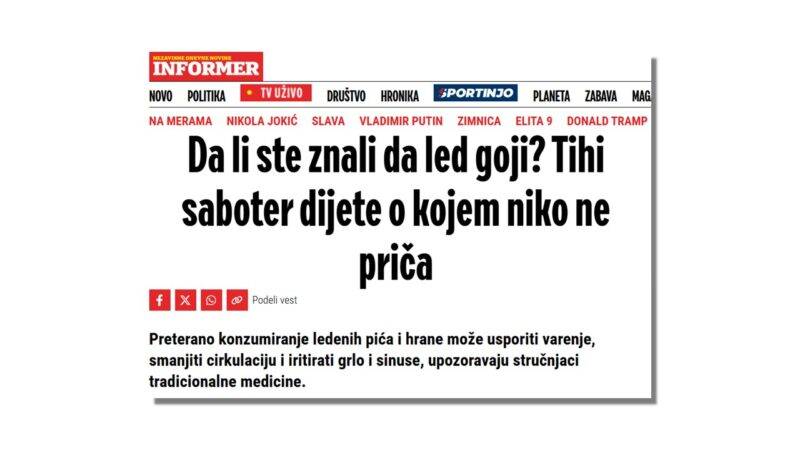 Tabloid Informer objavio je na svom portalu vest u čijem je naslovu izneta neobična tvrdnja da „led goji“. Ocenjujući led kao „tihog sabotera dijete“, autor teksta ove navode potkrepljuje argumentima proisteklim iz tradicionalne istočnjačke medicine. Međutim, na pitanje Tragača da li je moguće da konzumacija leda dovede do gojenja, profesor medicine sa Univerziteta Stanford dr Kristofer Gardner daje jasan odgovor – ne.
