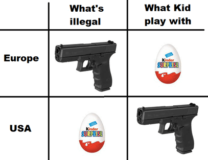 Pakao američkog zakonodavstva u vezi sa oružjem ciklično se ilustruje jednim te istim pričama i argumentima. Desi se školska pucnjava. Jedna strana ponavlja da je neophodna stroža regulacija kupovine i prodaje oružja, da je broj masakara i stradalih nedopustivo velik za tako razvijenu zemlju, nose se transparenti „Guns kill people because people have guns”. Druga strana se poziva na drugi amandman i tradiciju, kažu da problem nije u oružju nego u obolelim pojedincima, poručuje se „The only thing that stops a bad guy with a gun is a good guy with a gun”. A onda, tu su i mimovi – mimovi sa kinder jajima. Ima ih zaista mnogo (1, 2, 3…), ali uzmimo ovaj za primer: