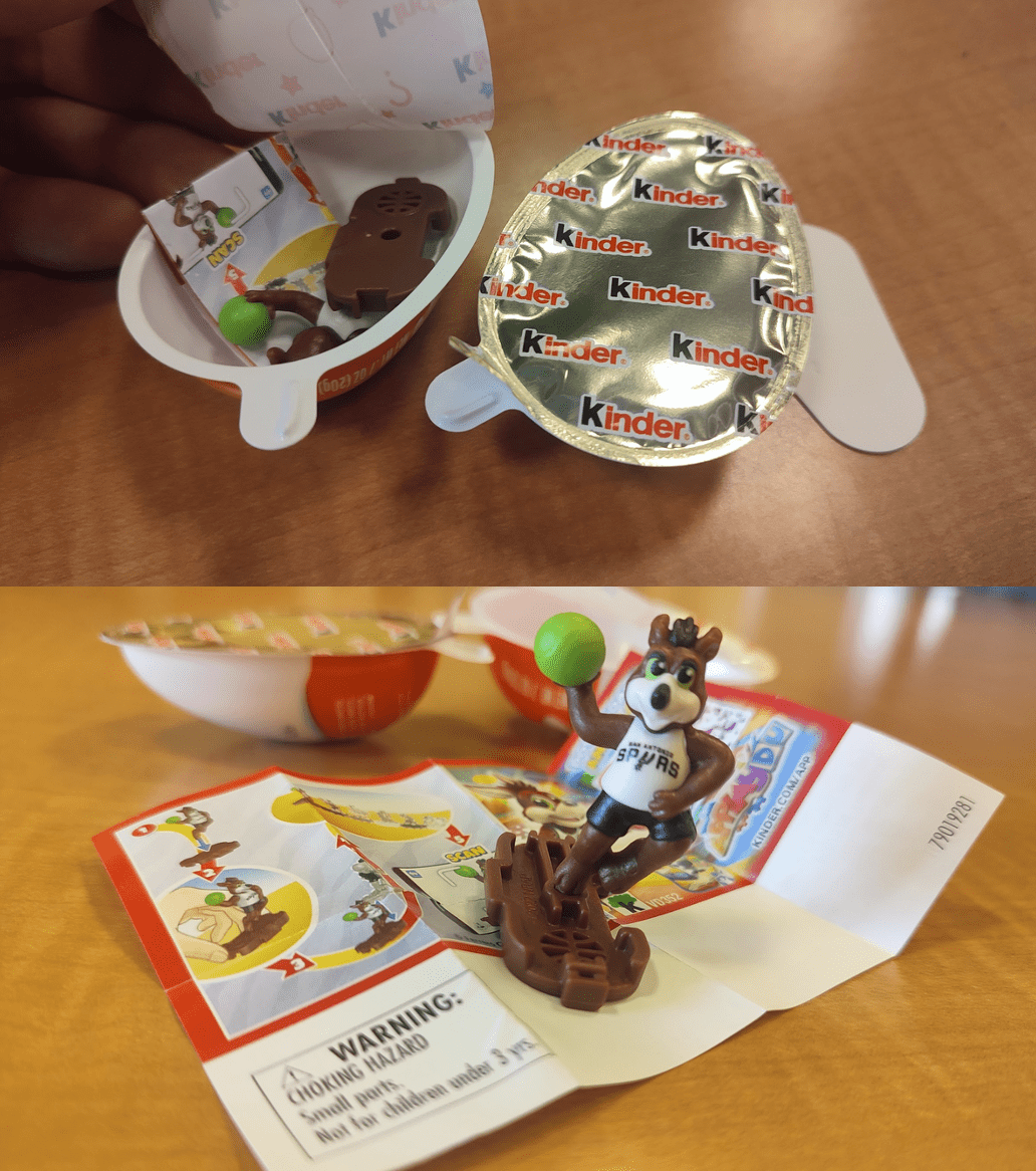 Uzevši sve u obzir, šta je ono što sam ja kupio? Reč je o novijoj, prepakovanoj verziji kinder jajeta, pod nazivom „kinder joy“. Njena prodaja je dozvoljena u SAD jer je igračka potpuno odvojena od slatkiša. A ako želite da saznate šta sam izvukao – well, open for surprise!