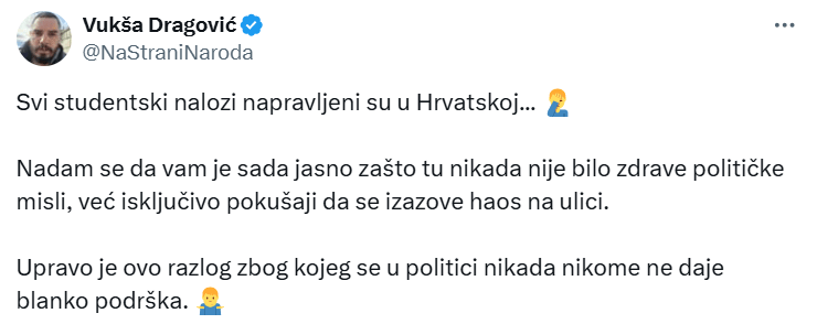 Njegovu objavu podelio je i narodni poslanik Srpske napredne stranke Vladimir Đukanović na svom nalogu komentarišući da je „neverovatno šta je hrvatska služba osmislila“. Veći broj ljudi video je i objave korisnika @AktivnoGlup i @PrijateljNaroda, u kojima se takođe ističe da se profilima studenata u blokadi upravlja iz Hrvatske, te insinuira da su i studentski protesti instruisani odatle. Ali skrinšotovi se nisu zadržali samo na platformi Ilona Maska – recimo, pevačica Jelena Karleuša podelila ih je na svojoj Fejsbuk stranici u toku jučerašnjeg dana, uz napomenu da su „SKORO SVI NALOZI STUDENATA U BLOKADI“ otvoreni u Hrvatskoj.
