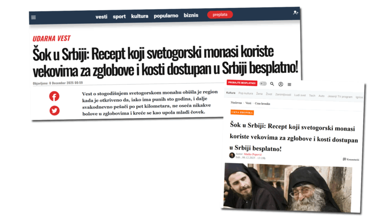 O preparatu „Flexi bone“ pisali smo nekoliko puta (1, 2, 3). Odlikuje se vrlo agresivnom onlajn kampanjom u kojoj se iznose lažne teze o komponentama „leka“, ali i o mogućnostima lečenja mišićno-koštanog sistema. Ranije ove godine, za preparat su navodno garantovali stručnjaci, a sada garantuju „monasi sa Svete gore“, predstavljeni i kao kreatori čudesnog rešenja. Čitaoci su nam prijavili dve varijante reklame, pri čemu se jedna zasniva na falsifikatu sajta Kurira, a druga na falsifikatu sajta Jutarnjeg lista iz Hrvatske. U prvom slučaju ukraden je i identitet Kurirovog novinara Ljubomira Radanova, koji je predstavljen kao „Marko Popović“.