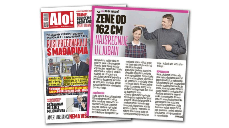 Alo je u svom štampanom izdanju od 24. decembra objavio vest pod naslovom „Žene od 162 cm najsrećnije u ljubavi“, o čemu je Espreso već pisao 2023. godine. Navodi se da je upravo 162 „magični broj“, do kog su došli istraživači iz Engleske. Ako žena nema tu idealnu visinu, bolje je da bude ispod nje. „Znamo da muškarce privlače žene koje bi u našoj evolucijskoj prošlosti bile simbol plodnosti. A u nekom smislu visina je negativan znak“ – citira se dr Netl, za kog se tvrdi da je vođa istraživanja.