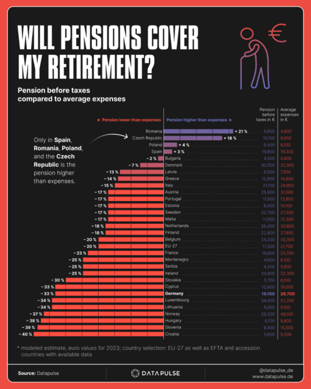 Važno pitanje jeste da li tzv. deficitarna penzija automatski dovodi do siromaštva? Odgovor je kratak: ne nužno. Iako postoji obrazac koji sugeriše da je rizik od siromaštva uglavnom niži u zemljama u kojima penzije premašuju rashode (i obrnuto), postoji i niz izuzetaka. Kako obrazlažu, „u zemljama poput Norveške, Slovačke i Luksemburga, gde državne penzije ne pokrivaju u potpunosti troškove života, rizik od siromaštva ostaje iznenađujuće nizak“ jer „u takvim sistemima državna penzija nije zamišljena kao jedini izvor prihoda“. Za razliku od pojedinih drugih zemalja, u ovim društvima razvijeni su „sekundarni i tercijarni sistemi“ kao što su privatna štednja ili penzione šeme koje obezbeđuju poslodavci, što pomaže penzionerima da žive komforno.