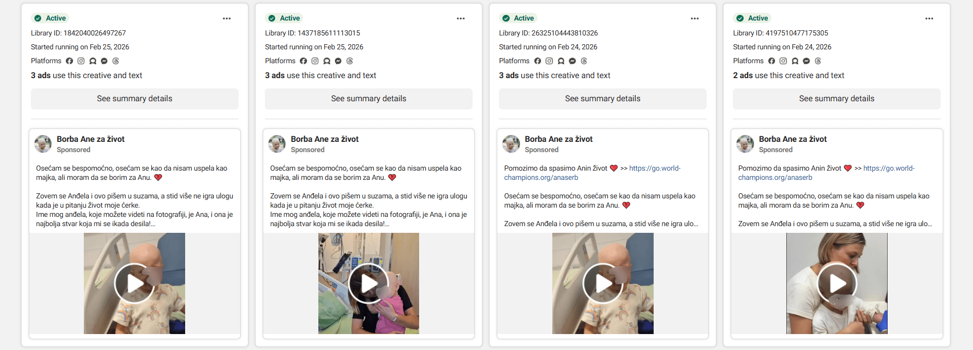 Stranica „Borba Ane za život“ kreirana je 16. decembra prošle godine. Prema podacima iz Metine biblioteke oglasa primarne lokacije sa kojih se upravlja stranicom su Izrael i Portugal. Više desetina reklama za ovu prevaru na srpskom jeziku trenutno targetira građane preko pet Metinih platformi.