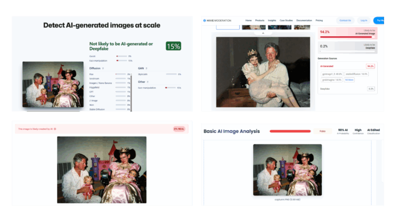 Interesantna i zabrinjavajuća činjenica jeste da pojedini alati za detekciju vizuelnog sadržaja kreiranog uz pomoć veštačke inteligencije, poput Sightengine, pretpostavljaju da su ove fotografije autentične. S druge strane, Undetectable.AI i Truthscan.com sa 98% sigurnosti navode da su verovatno kreirane od strane VI, a Hive Moderation sa 94,2 odsto.